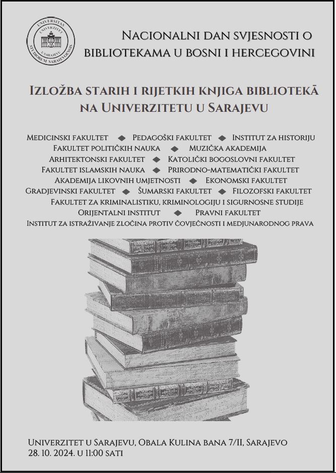 U okviru programa obilježavanja Nacionalnog dana svjesnosti o bibliotekama u Bosni i Hercegovini 2024, organizirana je Izložba starih i rijetkih knjiga biblioteka na Univerzitetu u Sarajevu koja će biti održana 28. oktobra 2024. godine u prostorijama Rektorata Univerziteta u Sarajevu od 11:00 do 14:00 sati.