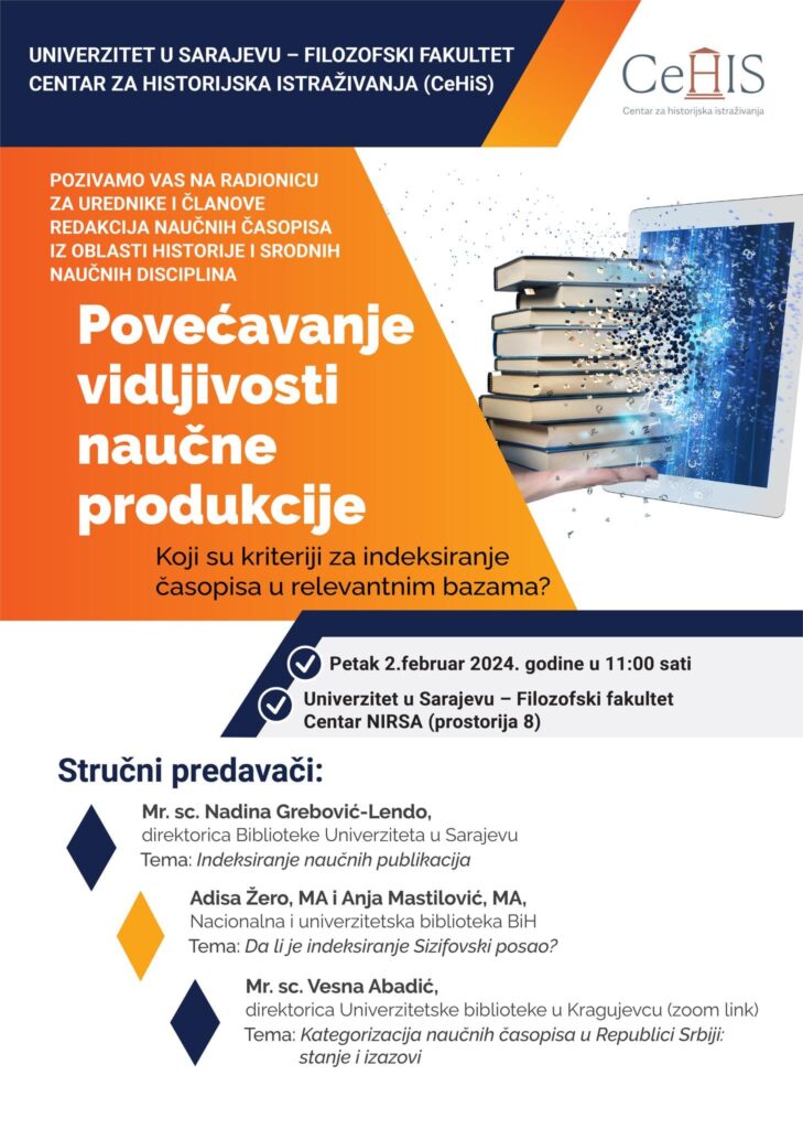 Centar za historijska istraživanja (CeHiS) organizuje radionicu „Povećavanje vidljivosti naučne produkcije“ koja će se održati 2.februara 2024. godine sa početkom u 11 sati. Cilj radionice jeste da se kroz predavanja i razmjenu iskustva unaprijedi rad časopisa iz oblasti historiografije i srodnih disciplina. Fokus radionice je na pitanju međunarodnog vrednovanja naučne publicistike kroz indeksaciju u citatnim bazama Web of Science (Clarivate Analytics) i Scopus ( Elsevier).
