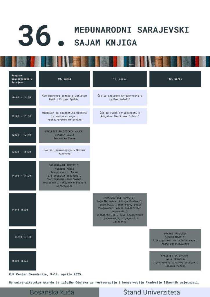 Univerzitet u Sarajevu je jedan od izlagača na XXXVI Međunarodnom sajmu knjiga i učila u okviru kojeg će biti organizirani brojni događaji koji prate ovogodišnju temu Sajma. Razvijenu izdavačku djelatnost – naučnu produkciju na sajamskom štandu će predstaviti fakulteti, akademije i instituti Univerziteta u Sarajevu, a bit će promovirane i bibliotečko-informacijske usluge biblioteka na Univerzitetu u Sarajevu.