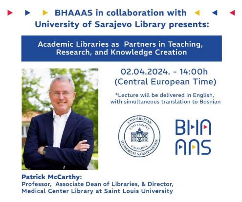 Bosanskohercegovačka američka akademija umjetnosti i nauka (BHAAAS) i Biblioteka Univerziteta u Sarajevu vas pozivaju na online predavanje Patricka McCarthya, profesora i pomoćnika dekana za biblioteke na Univerzitetu Saint Louis, te direktora Biblioteke medicinskog centra.